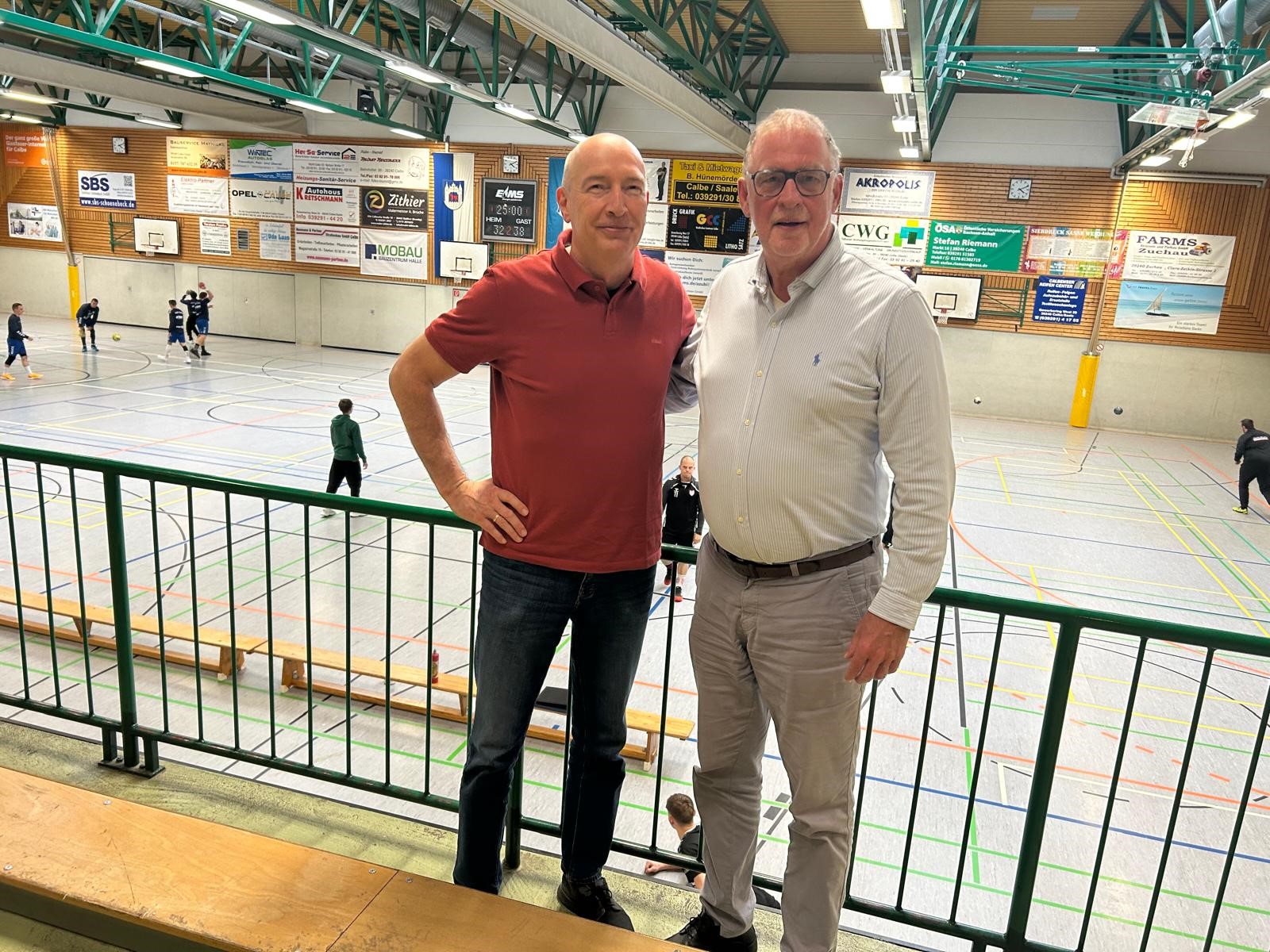 Kürzlich hatte die TSG-Handballabteilung prominenten Besuch. Helmut Kurrat, Leiter des Olympia-Stützpunktes in Magdeburg und seit Ende Mai Präsident des Handball-Verbandes Sachsen-Anhalt, war mit seiner Frau Dagmar zu Gast in der Calbenser Heger-Sporthalle. Gemeinsam mit Abteilungsleiter Gunnar Lehmann sah man sich das Oberliga-Spitzenspiel der männlichen C-Jugend zwischen der TSG Calbe und dem USV Halle an. Am Ende behielten die Gäste, mit Trainer Tim Kurrat, als aktueller Tabellenführer mit 38:32 die Oberhand. Nach der Partie wurde dann noch über die Nachwuchsförderung und Trainerausbildung im Kinder- und Jugendbereich gefachsimpelt.