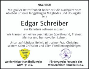 Der Weißenfelser Handballverein WHV 91 e. V. trauert um sein langjähriges Mitglied und Übungsleiter Edgar Schreiber